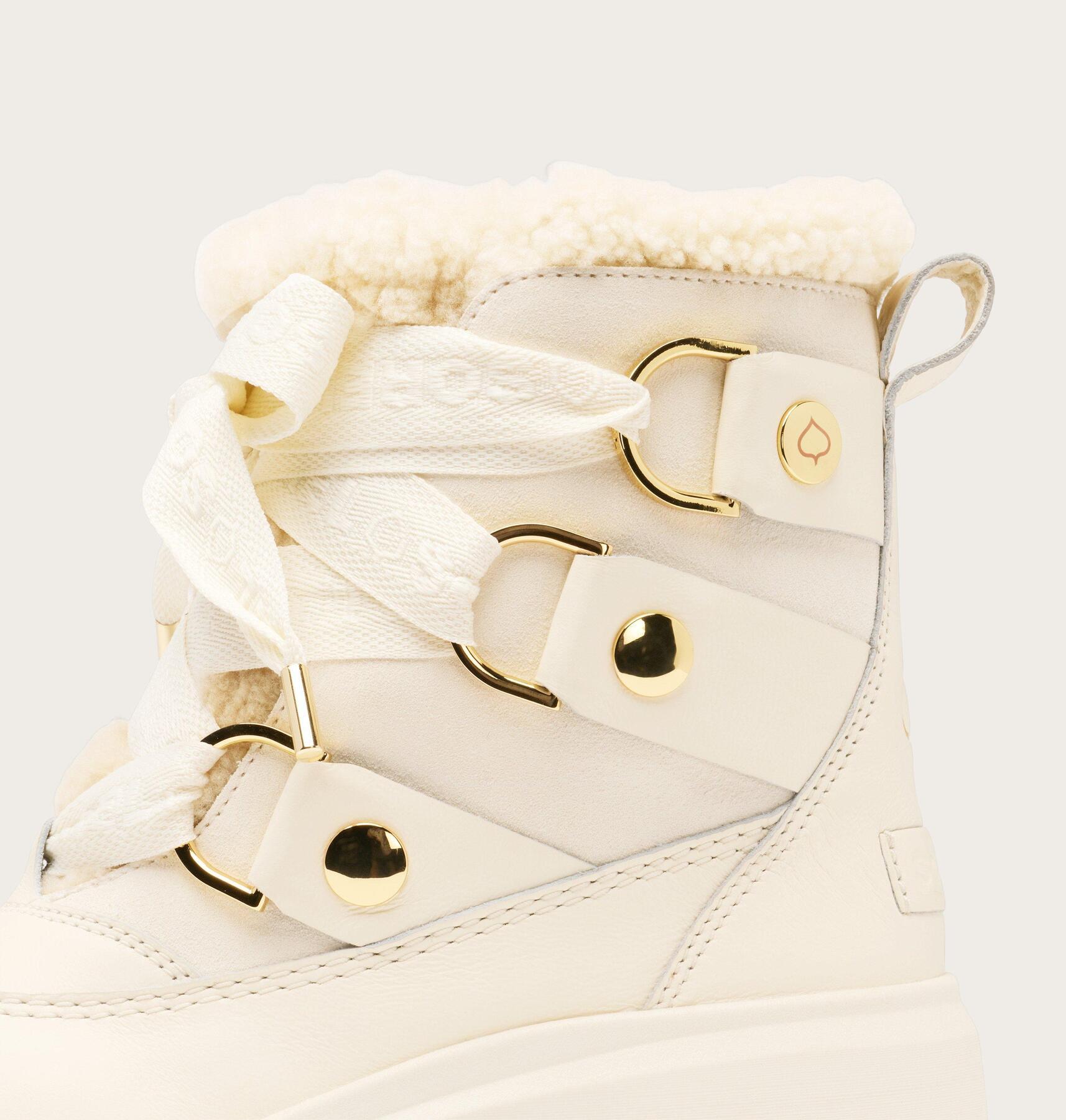 Upper: Waterproof Seam-Sealed Construction. Full Grain Leather And Suede Upper With Custom D-Ring Hardware. Genuine Shearling Collar And Tongue. Microfleece Lining. Laces Are Not Waterproof.